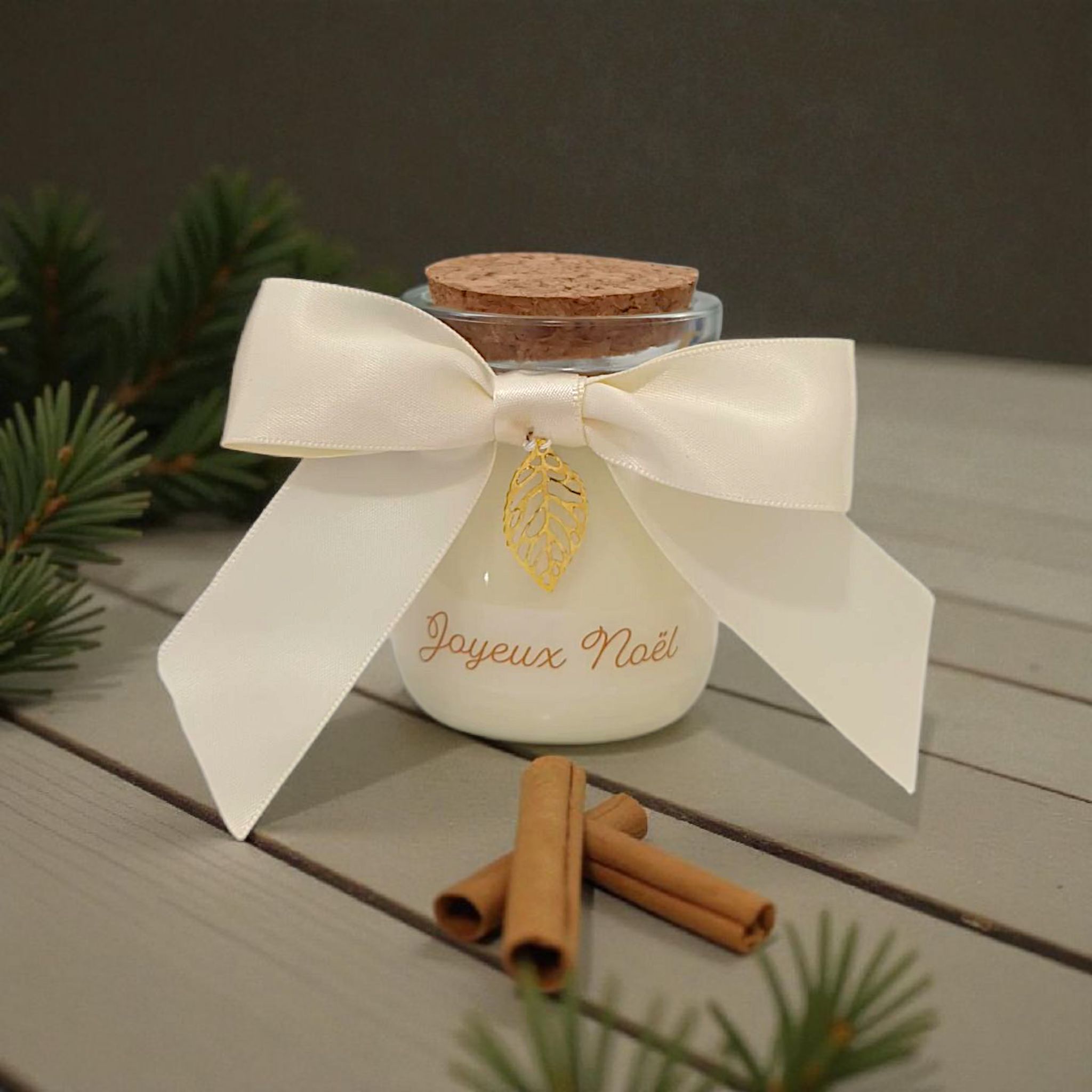 Son design raffiné, orné d’un large ruban ivoire satiné et d’un pendentif doré en forme de feuille, en fait un objet décoratif d’exception qui sublimera votre table, votre cheminée ou votre coin détente. La mention “Joyeux Noël” finement inscrite sur le verre ajoute une touche festive et élégante, parfaite pour célébrer la magie de Noël.