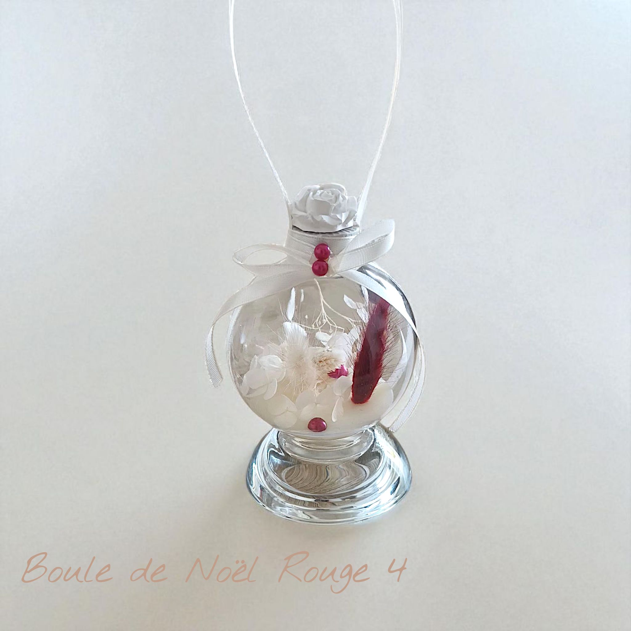 Cette boule de Noël transparente révèle un délicat univers floral, composé de véritables fleurs séchées blanches, associées à de plumes bordeaux soigneusement disposées.