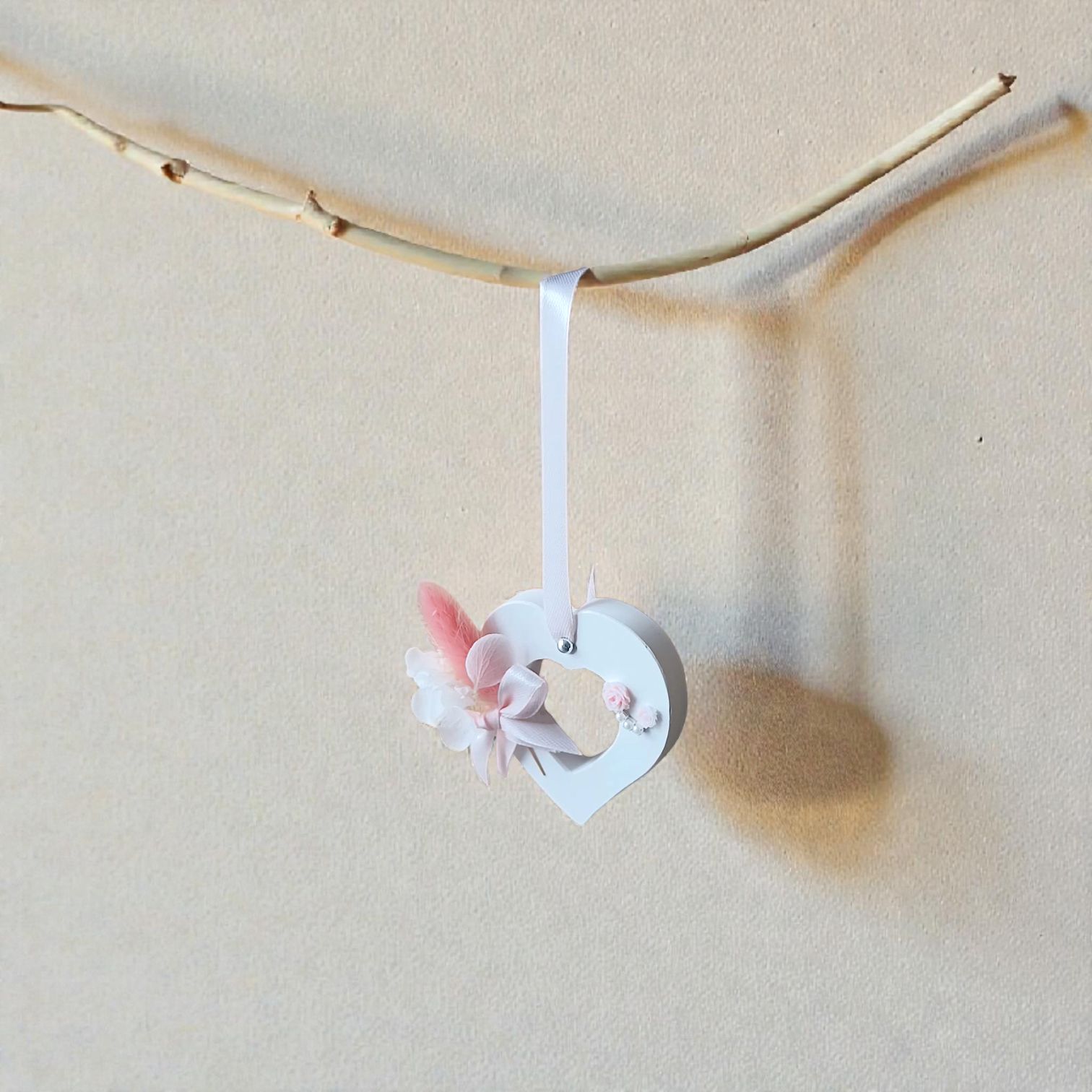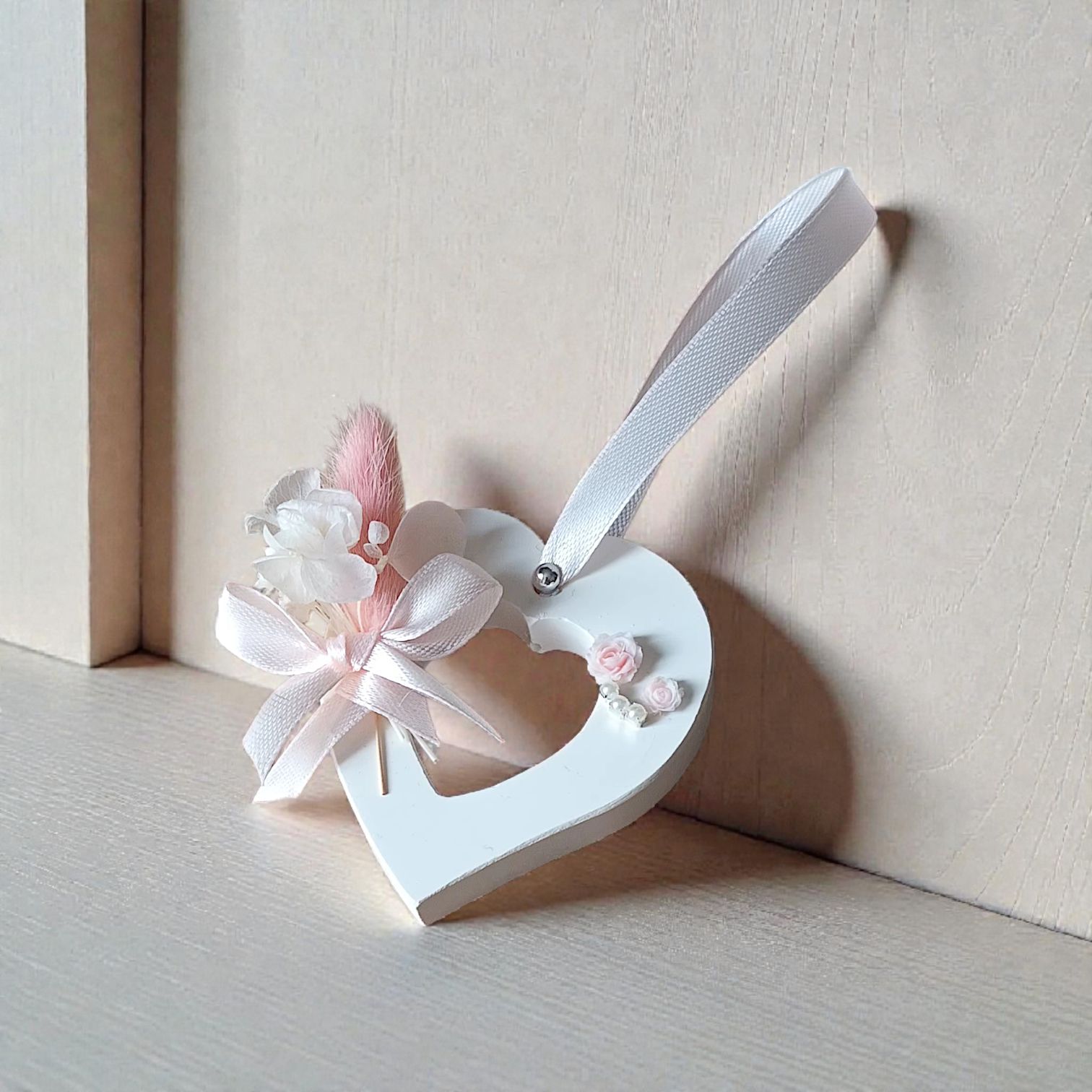 Chaque cœur est orné d’un bouquet miniature composé de fleurs séchées, d’une plume délicate et d’un nœud en ruban satiné noué à la main. De petites roses sculptées et une touche de perles viennent subtilement enrichir l’ensemble, créant un jeu de textures à la fois doux, poétique et harmonieux.