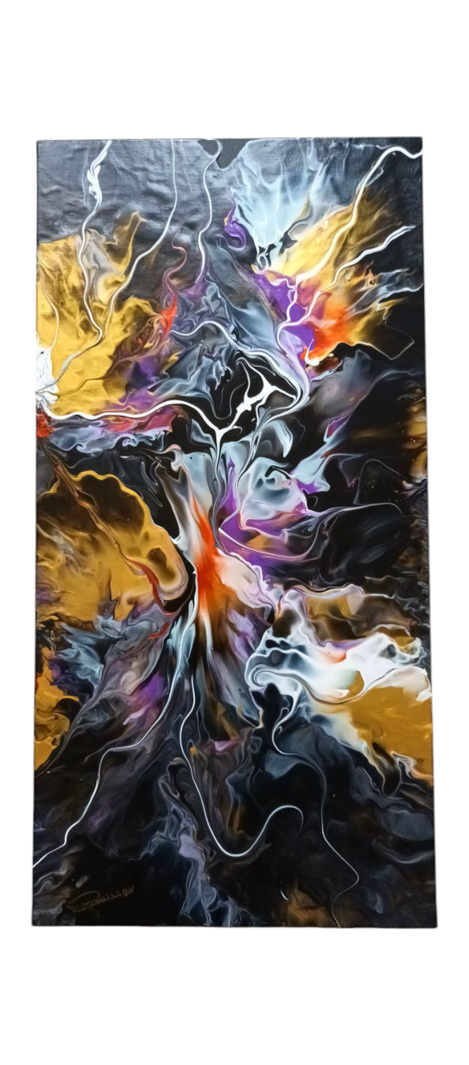 Plongez dans l’univers fascinant d’ Aurore Nocturne, où la fusion des couleurs et la fluidité des formes captivent immédiatement le regard. Réalisée avec la technique du pouring, cette peinture exprime une énergie puissante et organique, semblable à une explosion de lumière et de matière au cœur d’un espace mystérieux. Sur un fond noir intense, des volutes de blanc, de doré, de violet et d’orange flamboyant se déploient avec une élégance saisissante. Le noir profond agit comme une toile céleste, mettant en valeur l’éclat des teintes lumineuses qui semblent jaillir d’un point central, évoquant une fleur en pleine expansion, une nébuleuse…