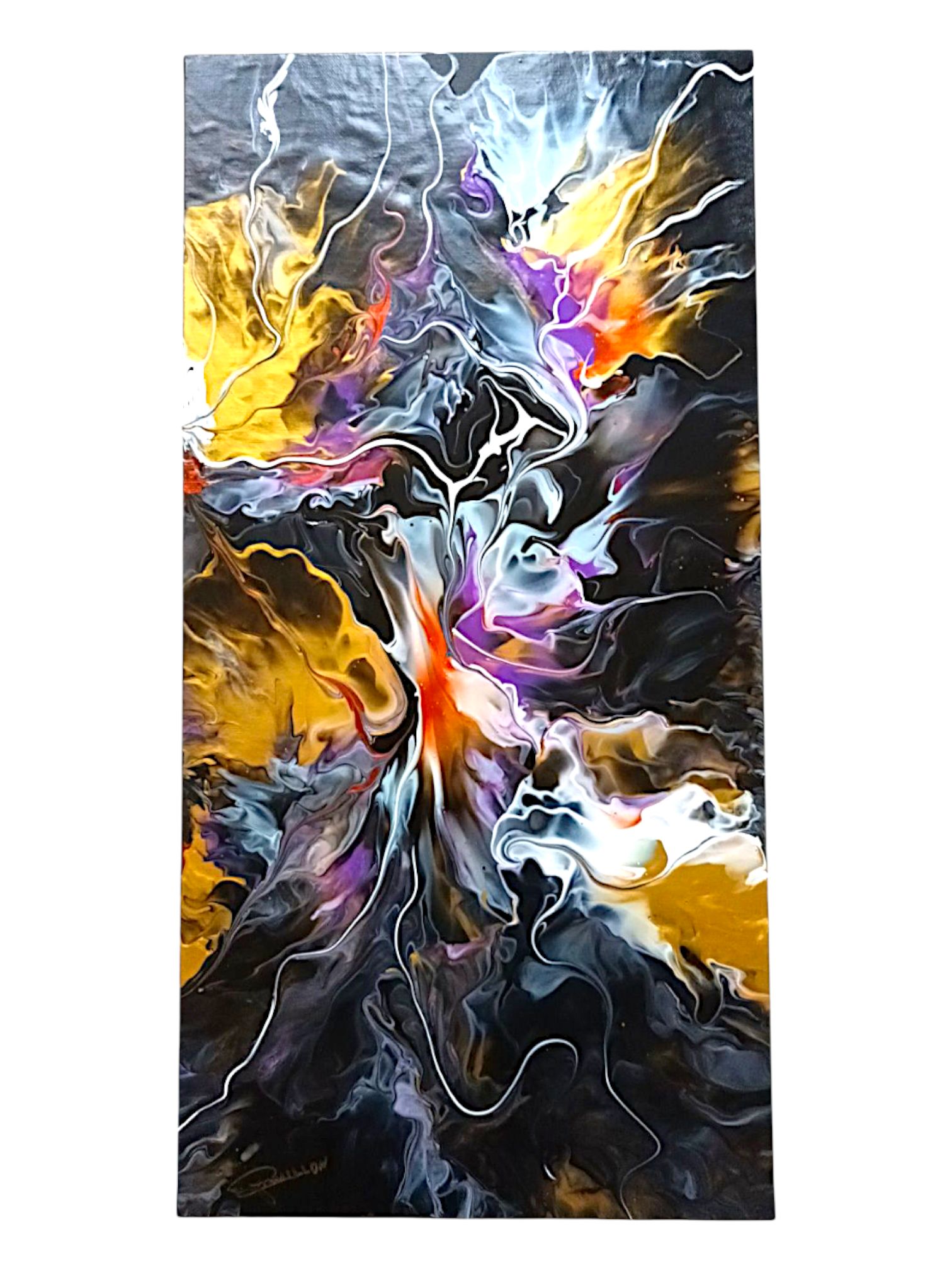 Sur un fond noir intense, des volutes de blanc, de doré, de violet et d’orange flamboyant se déploient avec une élégance saisissante. Le noir profond agit comme une toile céleste, mettant en valeur l’éclat des teintes lumineuses qui semblent jaillir d’un point central, évoquant une fleur en pleine expansion, une nébuleuse cosmique ou encore une danse incandescente d’éléments naturels comme les aurores boréales.. Les nuances dorées, riches et chatoyantes, confèrent une touche précieuse et raffinée à l’ensemble, tandis que le violet apporte une dimension mystique et envoûtante. Les touches d’orange, vibrantes et dynamiques, insufflent une intensité presque volcanique à l’œuvre, renforçant l’effet de mouvement et de vitalité.